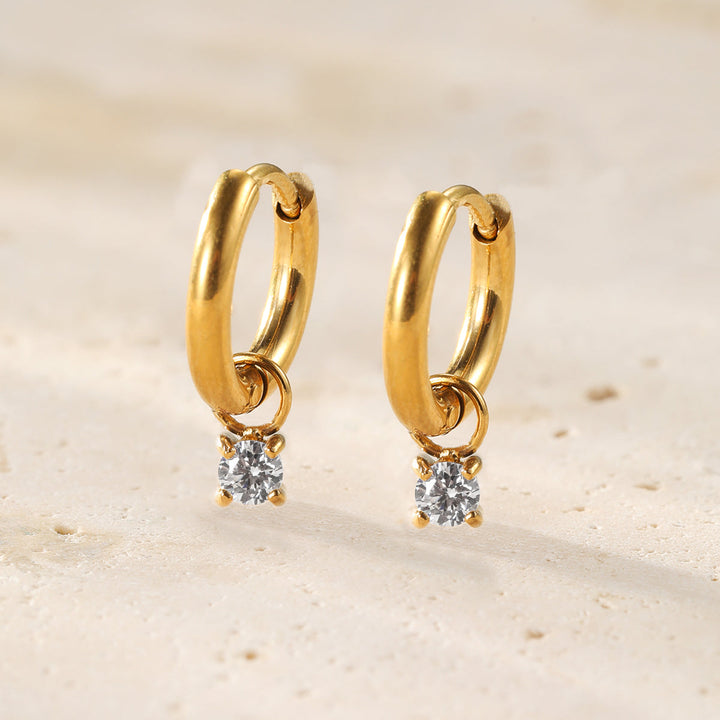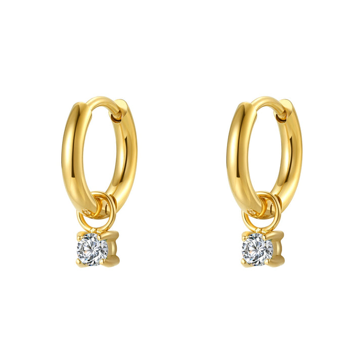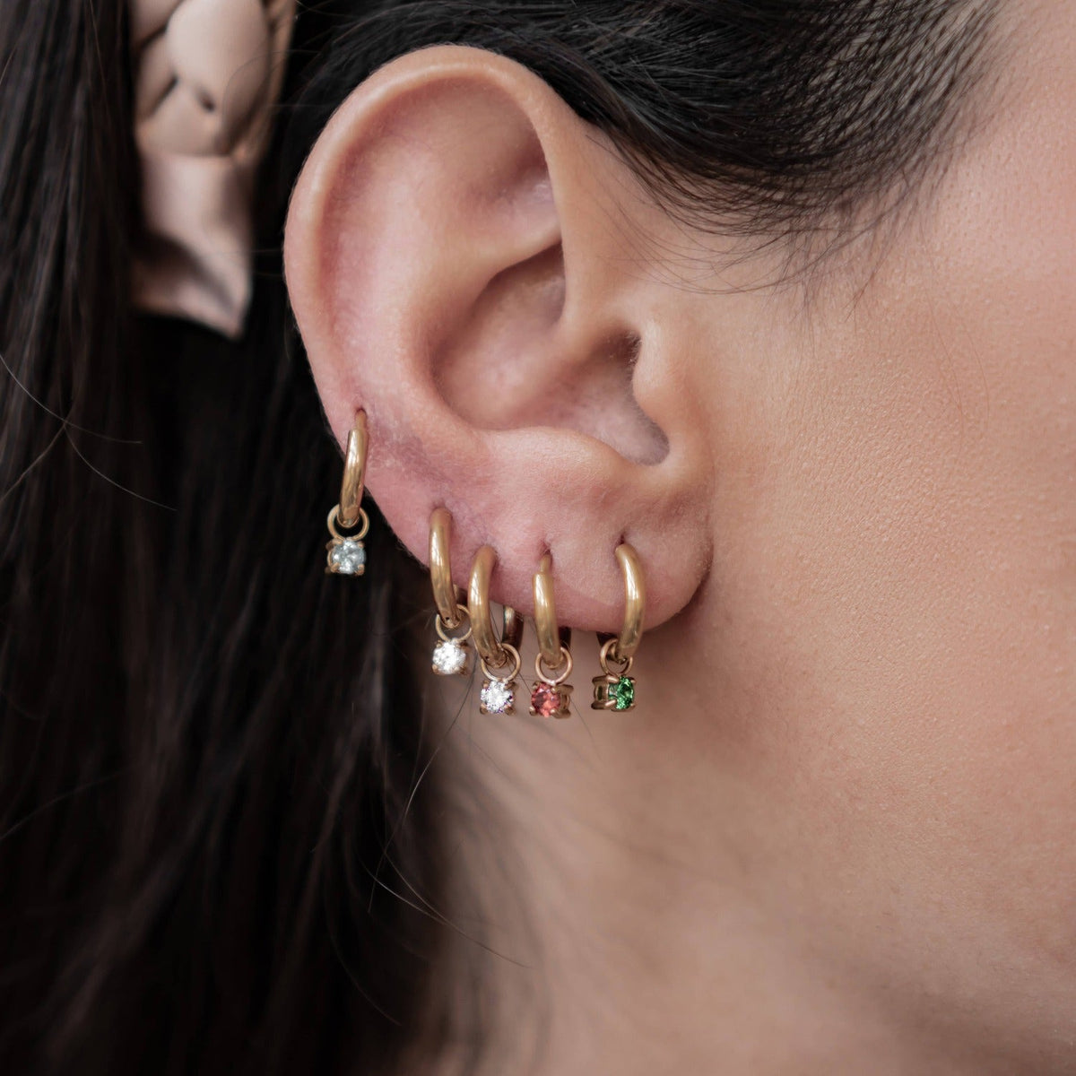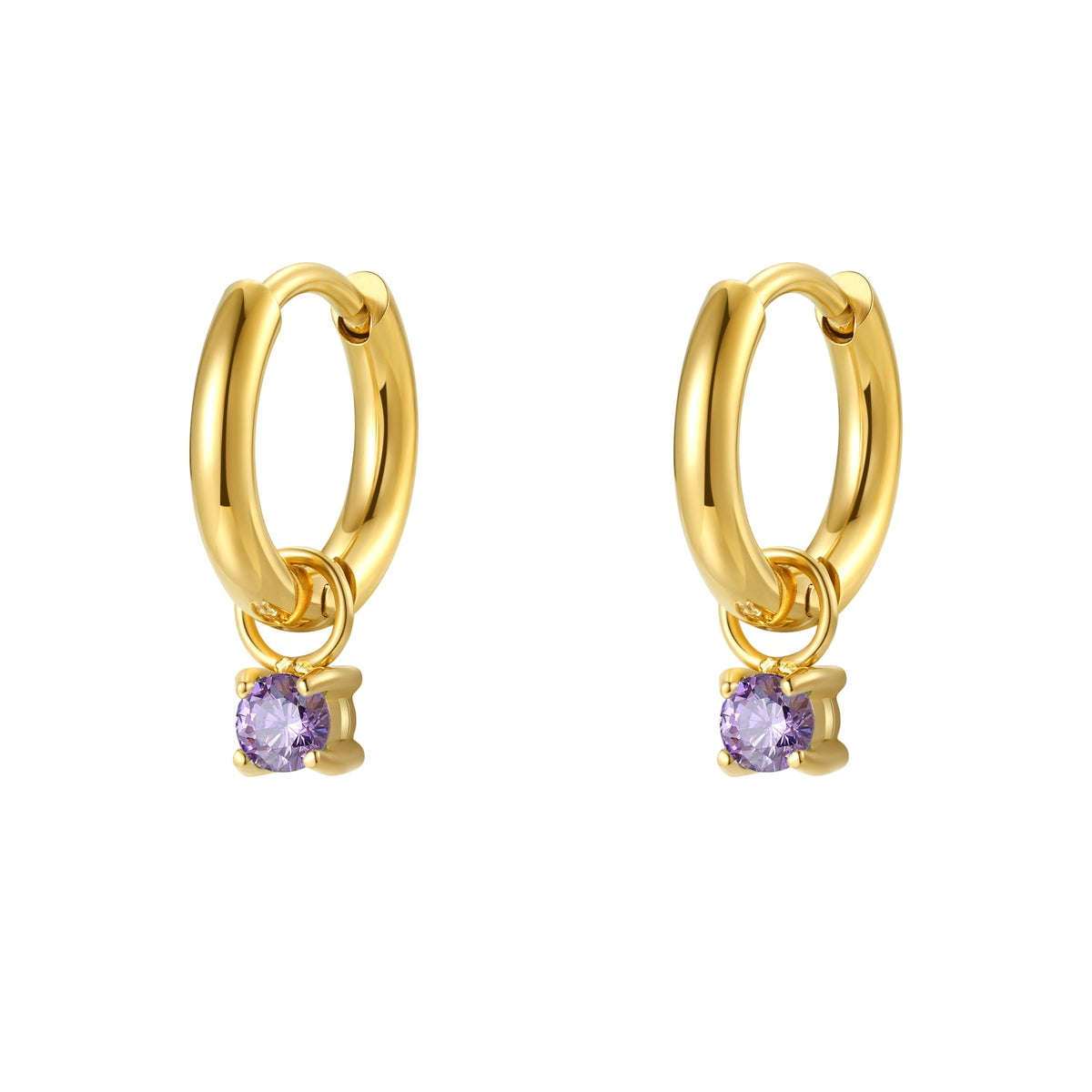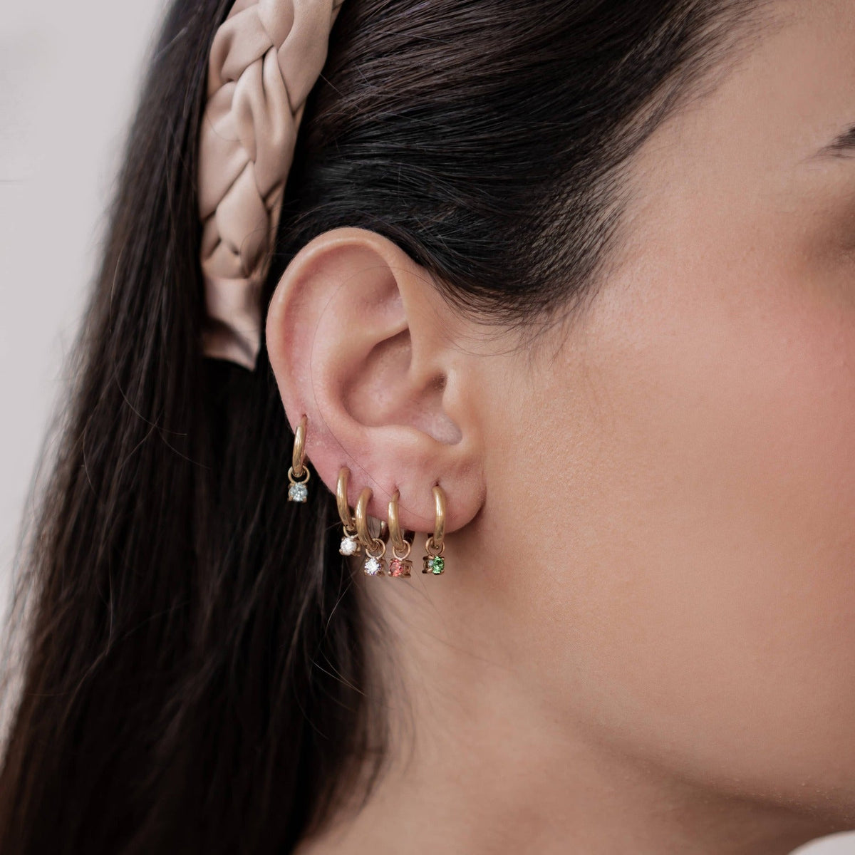 Made from stainless steel. Hoop earrings with hanging rectangular gemstones in White, Purple, Aquamarine, Green, and Red. Clasp type not specified.