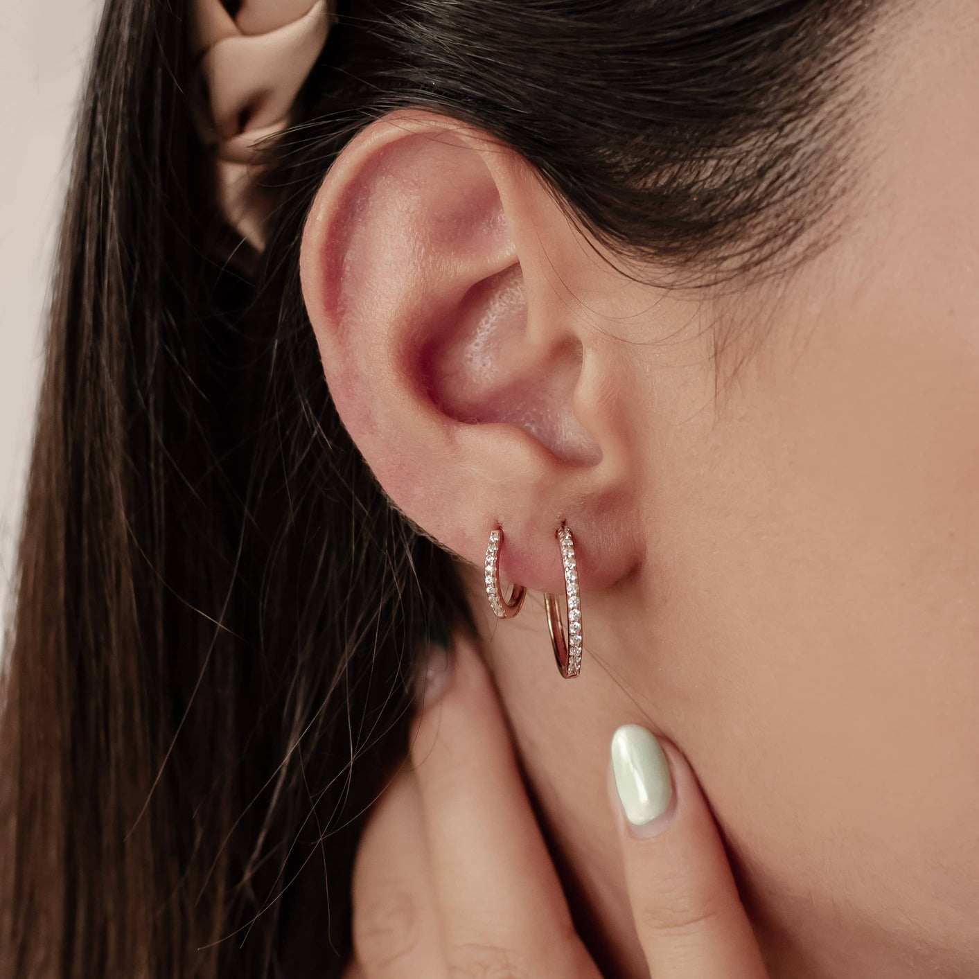 Sterling silver hoops with zirconia stones. Includes two pairs of different sizes. Available in gold, rose gold, and silver finishes.