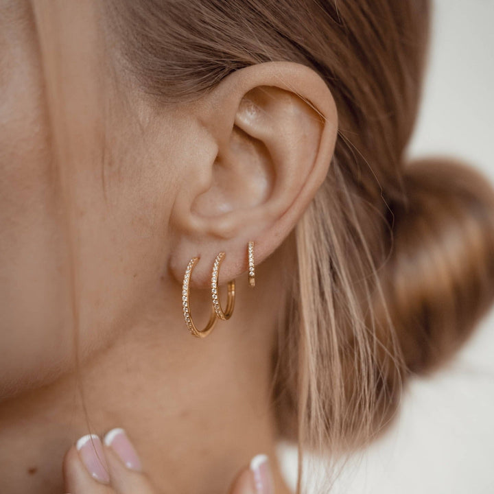 These Clear Stone Hoop Earrings Sterling Silver by Hey Happiness are timeless hoops elevated with seventeen tiny clear stones set along the front edge. Made from high-quality sterling silver, available in gold, rose gold, and silver finishes, and offered in two sizes to suit any style.