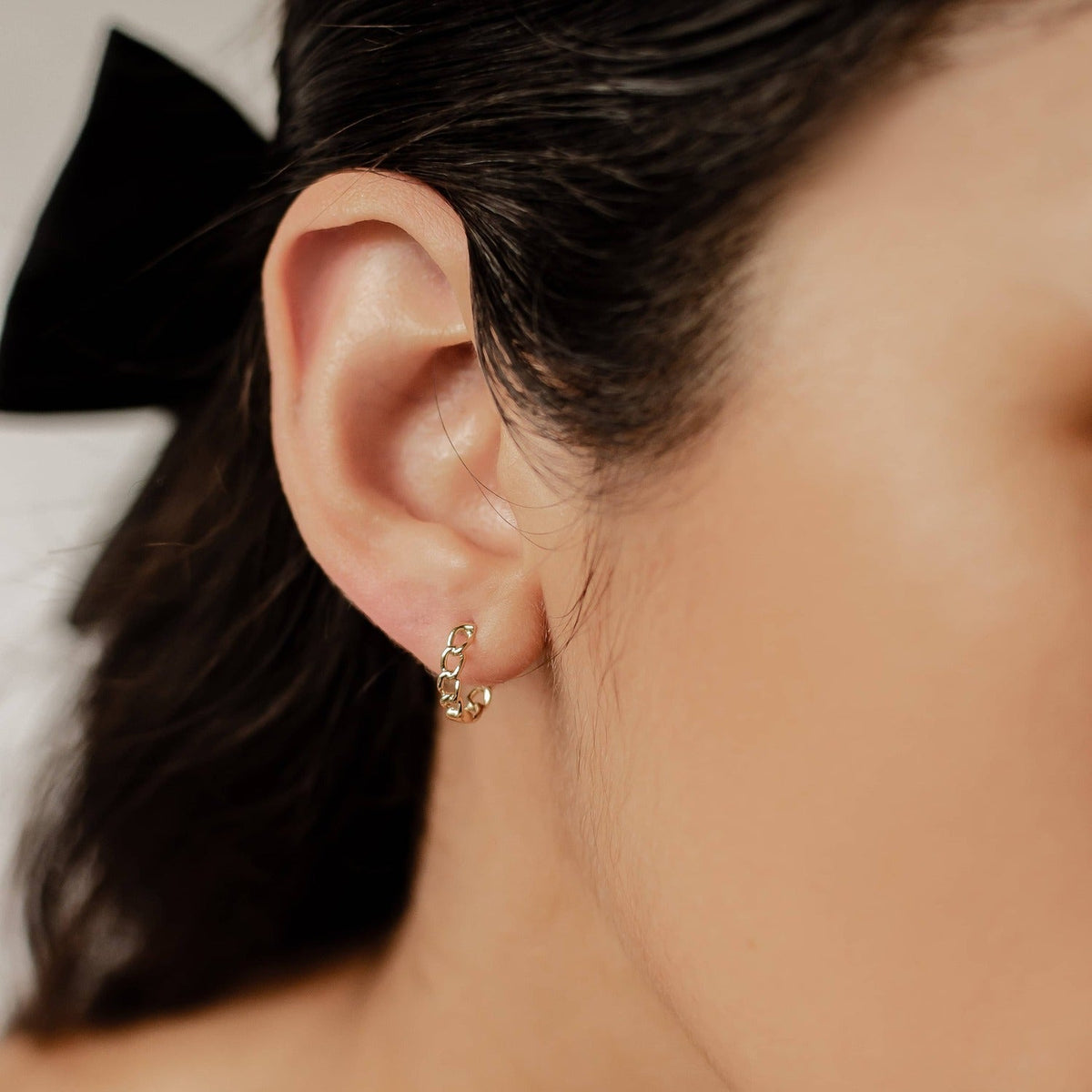 These Infinite Links Huggie Earrings 14K Gold by Hey Happiness are crafted from solid 14K gold featuring a chunky chain design of eight linked pieces. These unique huggies hug the earlobes elegantly, symbolizing the eternal bond of infinity and combining statement style with timeless sophistication.