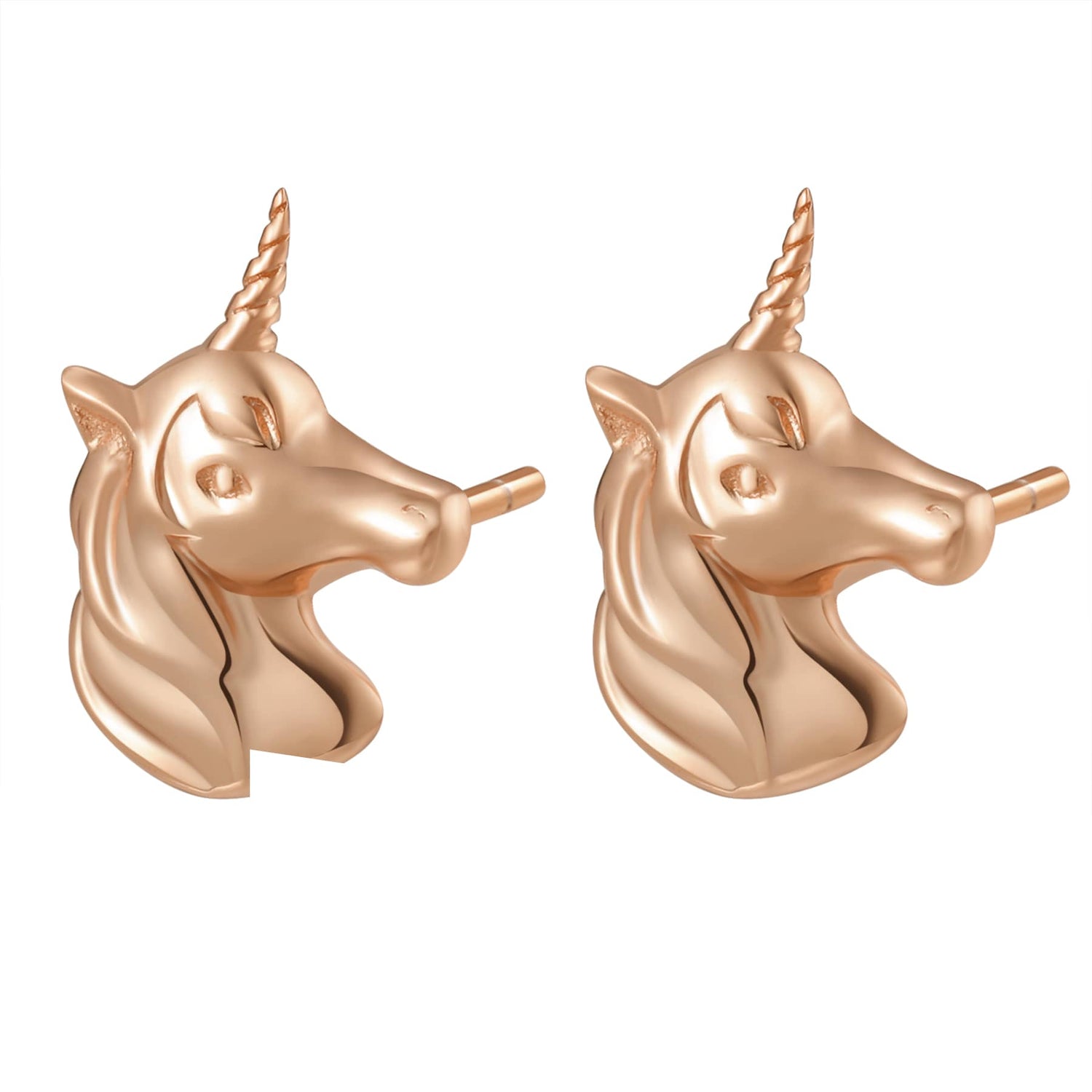 Crafted from 925 sterling silver, available with 18K gold plating or rose gold plating. Small stud design featuring detailed unicorn profile.