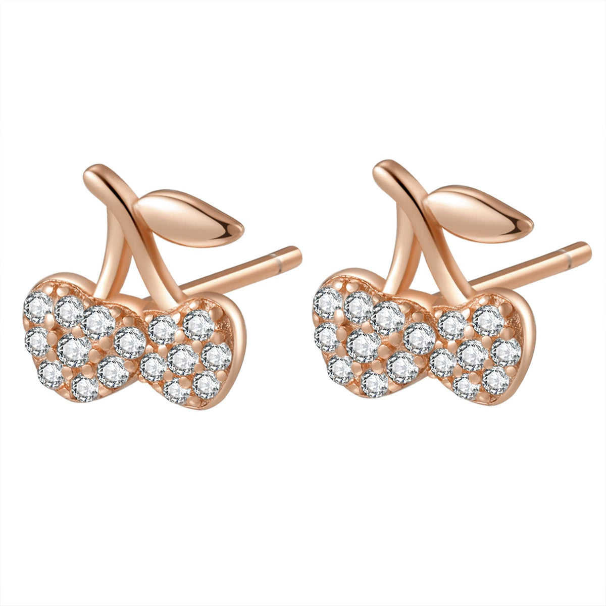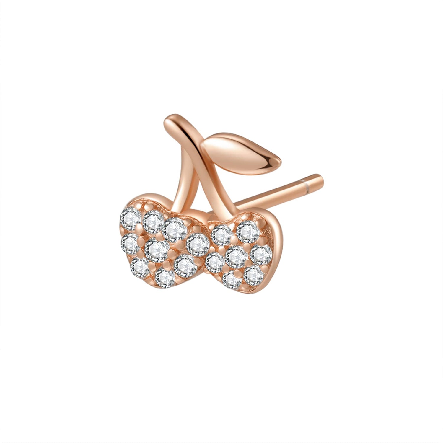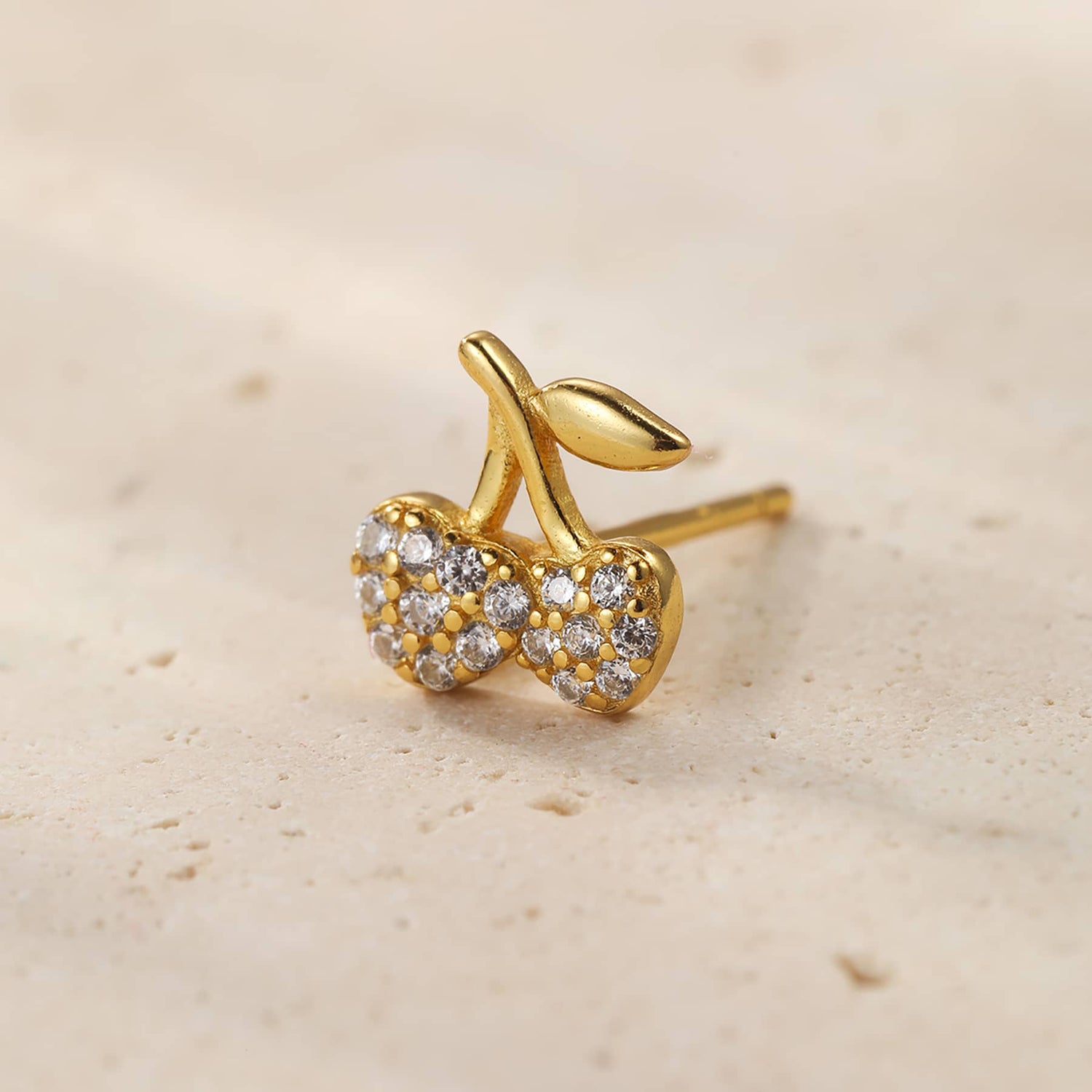 These Cherries Stud Earrings by Hey Happiness add retro charm with a playful design featuring a pair of cherries encrusted with 16 tiny zirconia stones and a short stem with a leaf. Available in sterling silver, 18K gold-plated sterling silver, and rose gold-plated sterling silver, they fasten securely with butterfly clasps and make a fun, sparkling statement.