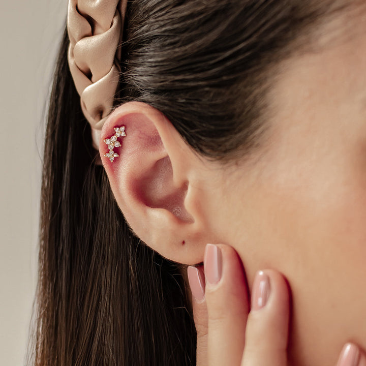 These Daisy Stud Earrings Piercing Sterling Silver by Hey Happiness showcase three delicate flower motifs adorned with zirconia stones. Crafted for comfort with a secure ball-shaped closure, these earrings are perfect for versatile styling in gold and silver finishes.