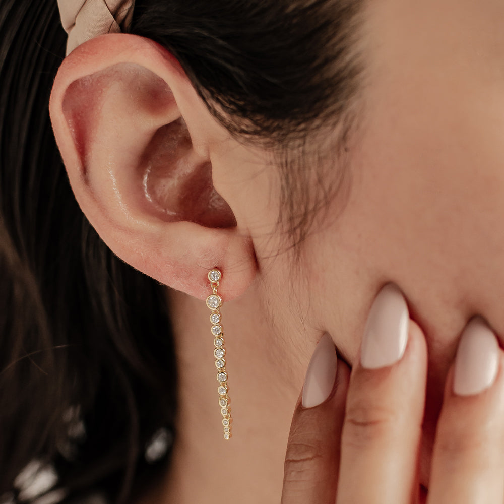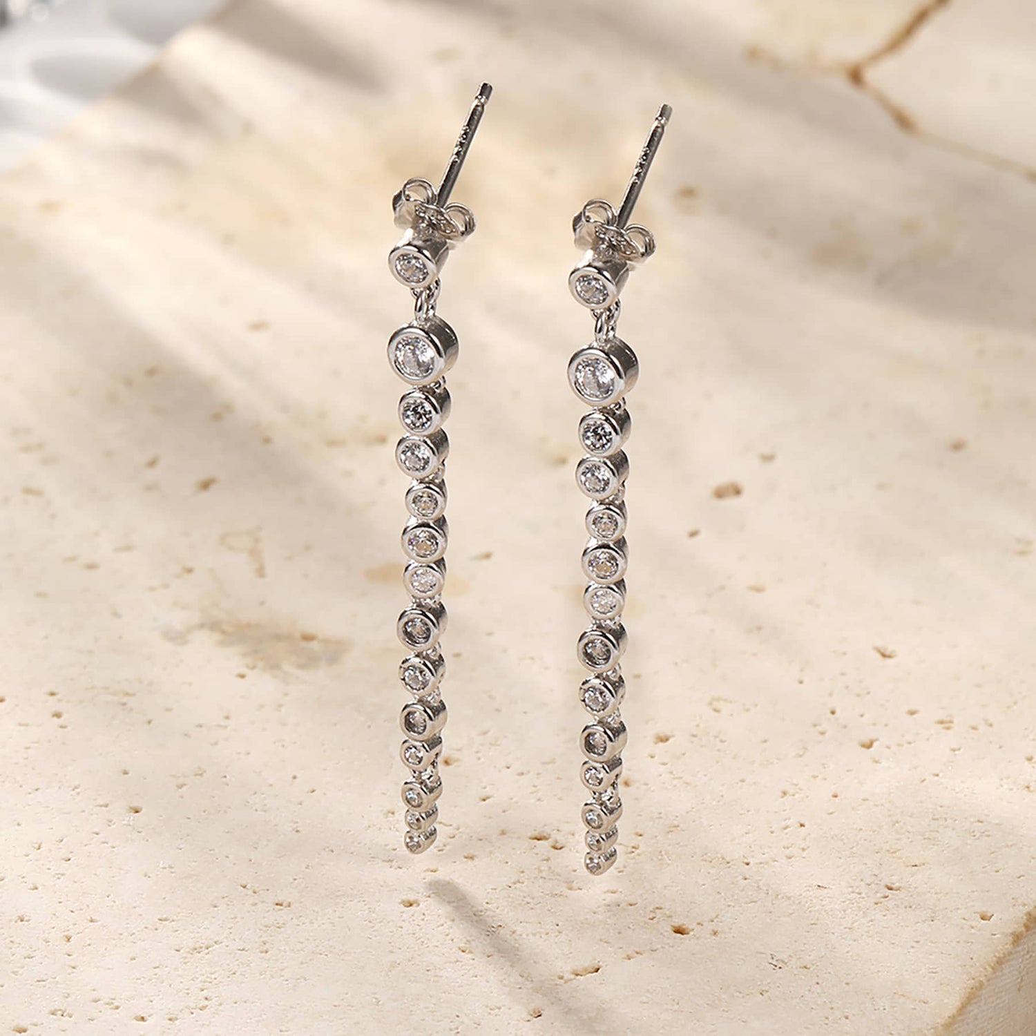 These Orb Chain Drop Stud Earrings Sterling Silver by Hey Happiness combine high-quality sterling silver with a unique design featuring 14 orb-shaped stones encrusted with sparkling zirconia. These earrings offer sophisticated glamour and versatile wear.