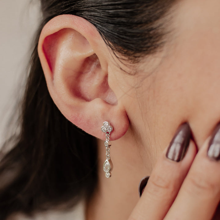 These White Triad Drop Stud Earrings by Hey Happiness add elegant movement with a triad-inspired stud accented by three dangling zirconia gemstones. Crafted in sterling silver and available in gold and silver finishes, these earrings bring a refined sparkle to any outfit.