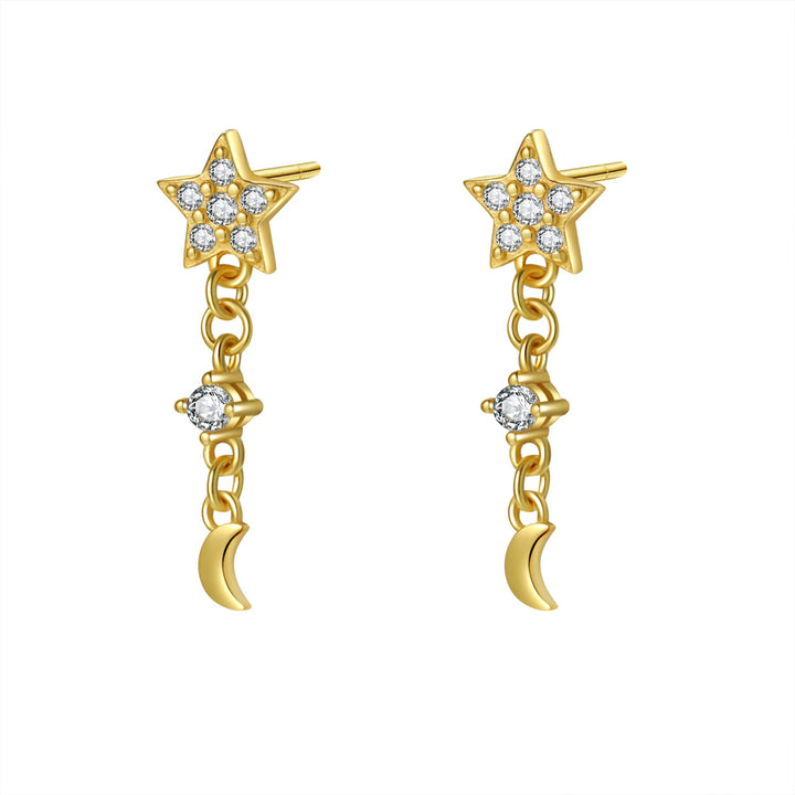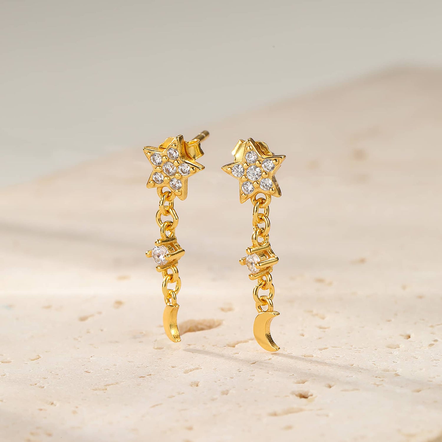 These Star and Moon Drop Stud Earrings Sterling Silver by Hey Happiness make a celestial statement with a star-shaped stud and dangling moon and gemstone accents. Crafted from sterling silver, available in gold and silver, they blend elegance with playful charm.