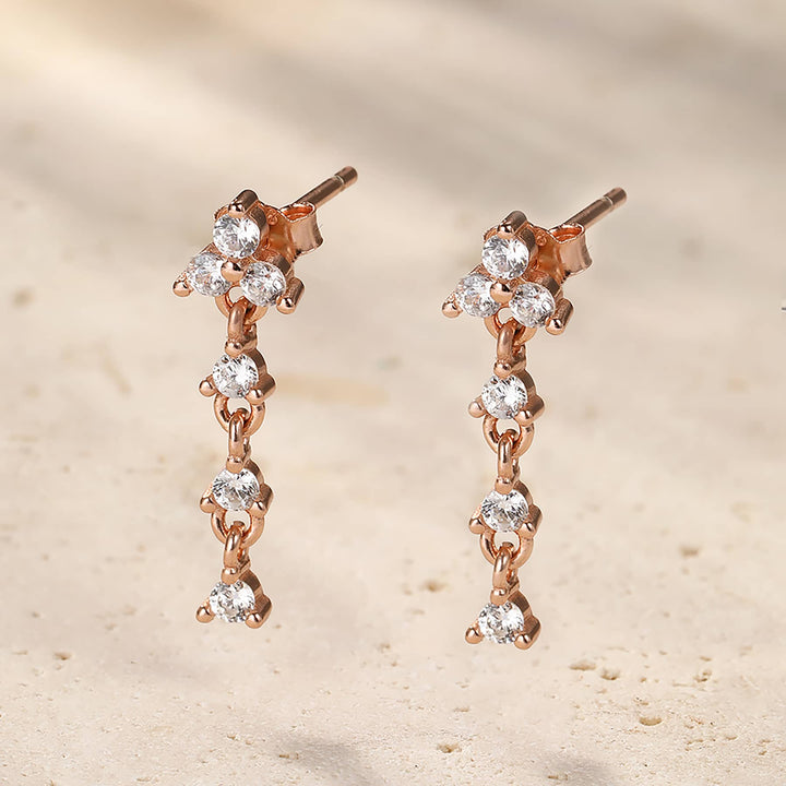 These Trinity Drop Stud Earrings Sterling Silver by Hey Happiness feature a graceful drop design with a trio of sparkling zirconia stones. Crafted from sterling silver and available in gold, rose gold, and silver, they add movement and shine to elevate any outfit.