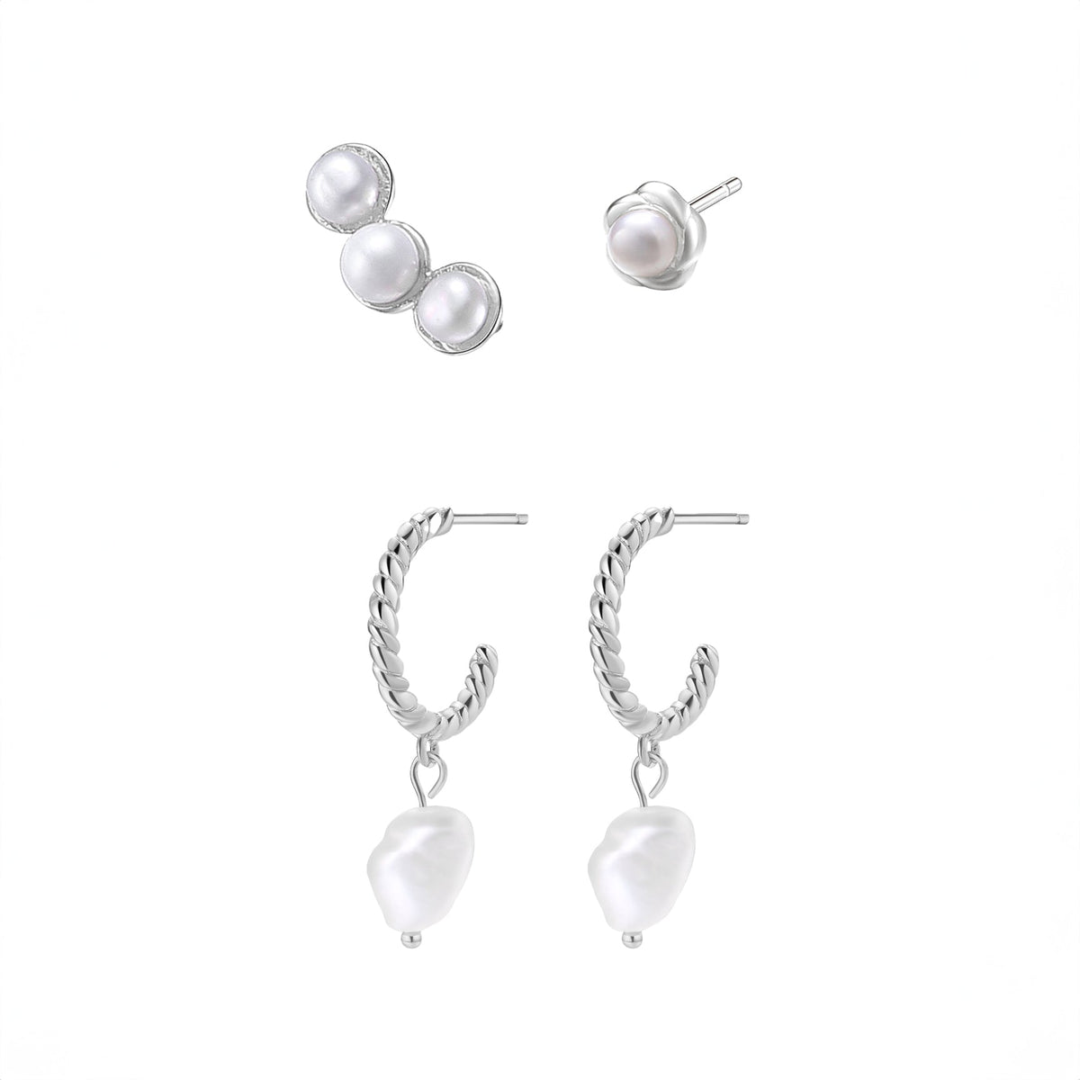 Crafted in sterling silver, includes twisted rope hoop earrings with natural pearl drops, a half-moon shaped triple pearl stud, and flower petal stud with freshwater pearl center. Available in gold and silver.
