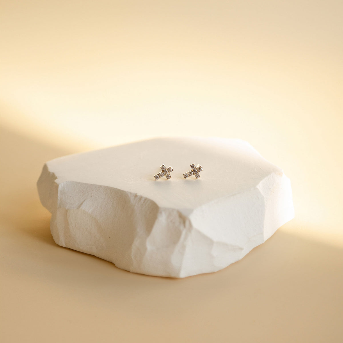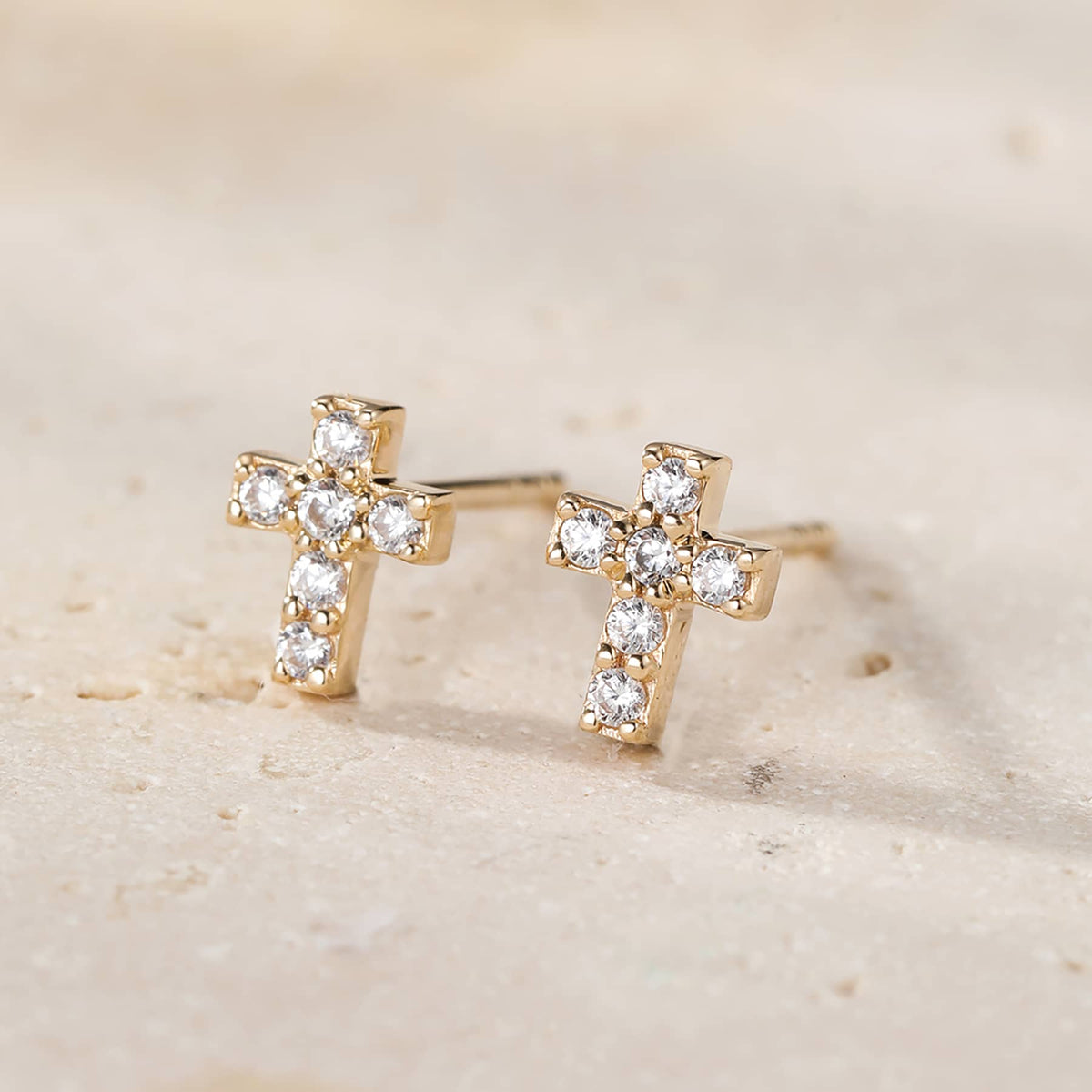 These Hope Stud Earrings 14K Gold by Hey Happiness feature a delicate cross design adorned with sparkling zirconia stones. Crafted from quality 14-karat gold, they are available as a single stud or pair, combining elegance and faith.