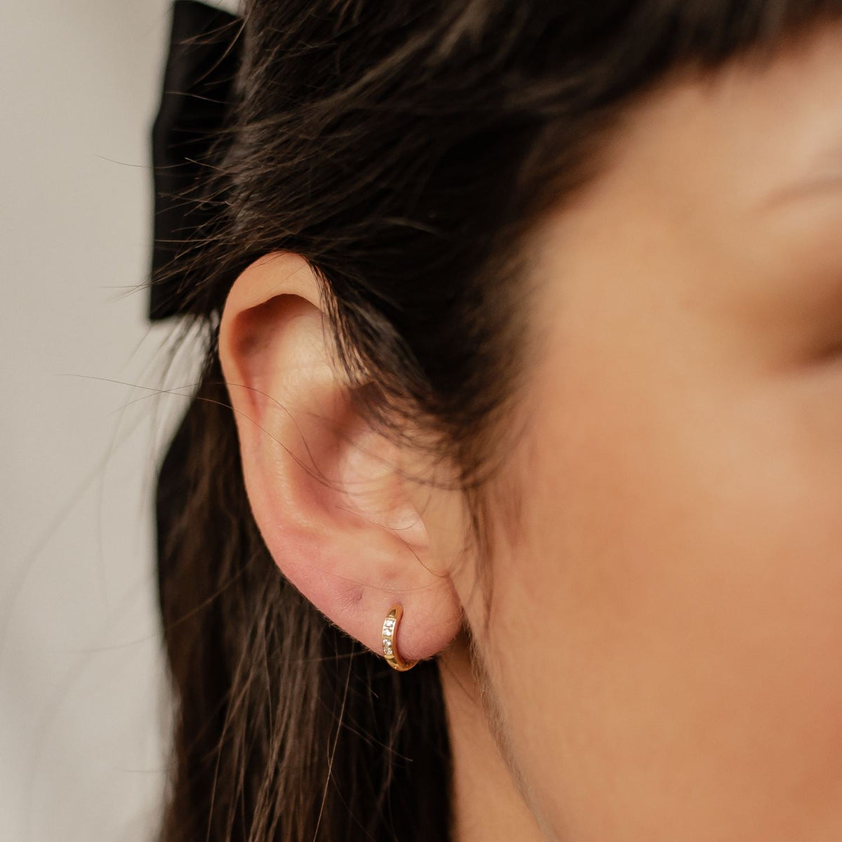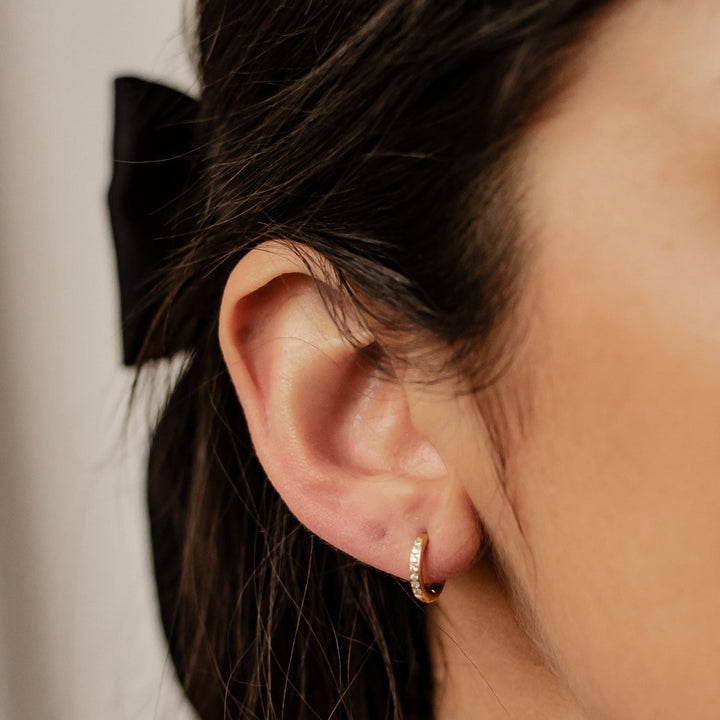 The Clear Stone Hoop Earrings by Hey Happiness elevate any look with clear stones set along stainless steel hoops. Available in two sizes, these durable earrings make a perfect statement piece for any occasion, blending sparkle with lasting quality.