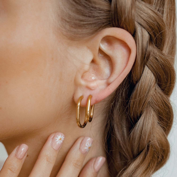 Made from premium stainless steel with a polished finish. Includes two pairs: small hoops approx. 20 mm x 12 mm, large hoops approx. 35 mm x 20 mm. Hinged clasp closure.