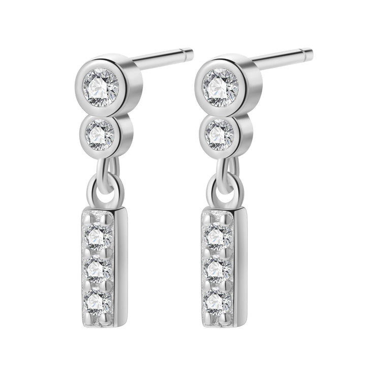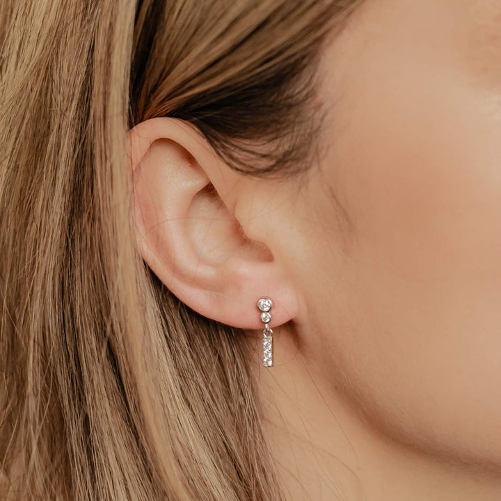 Sterling silver with zirconia orbs and dangling gemstone bar. Available in gold and silver.