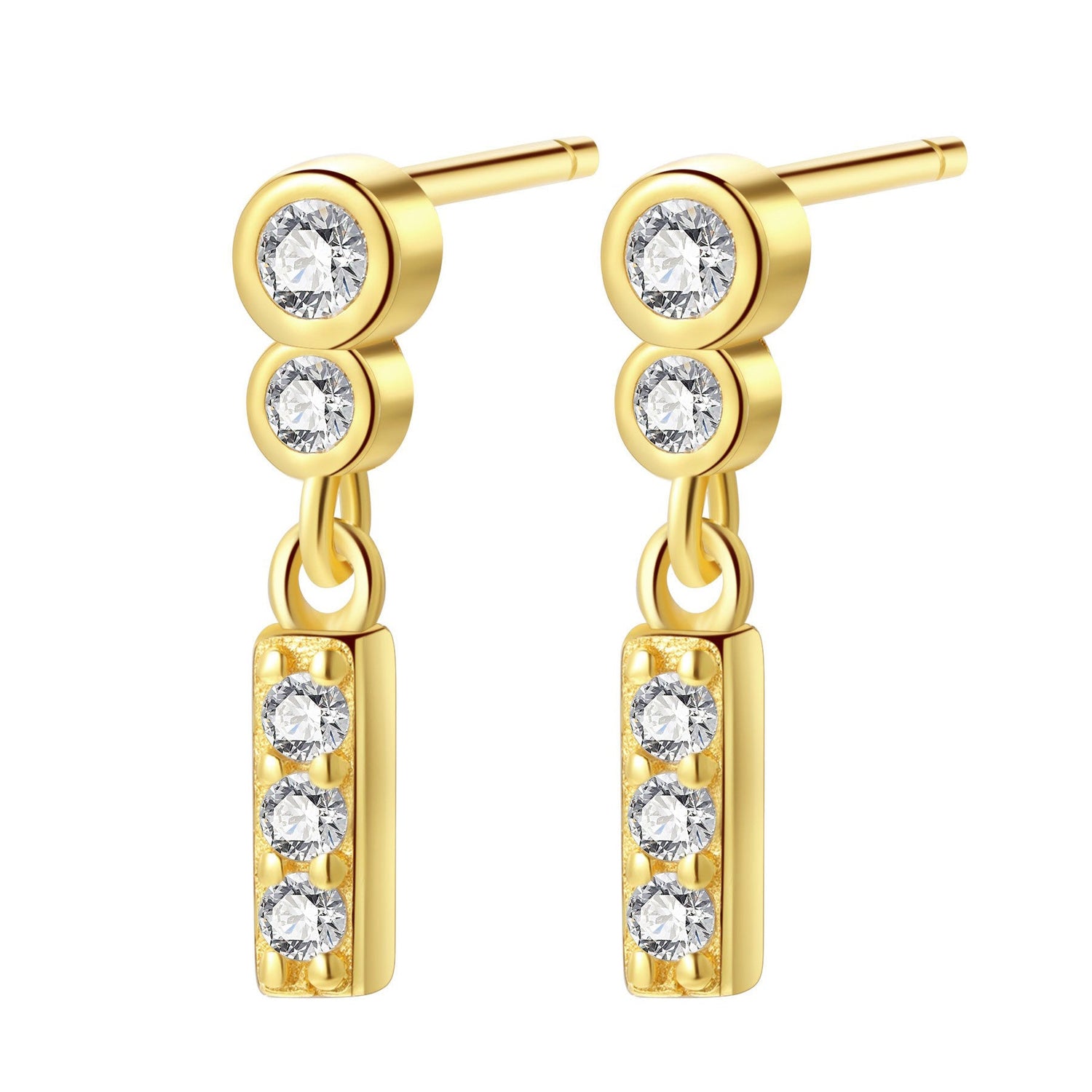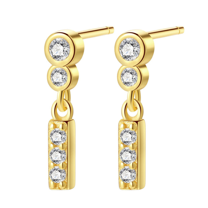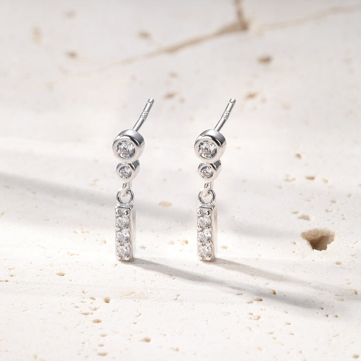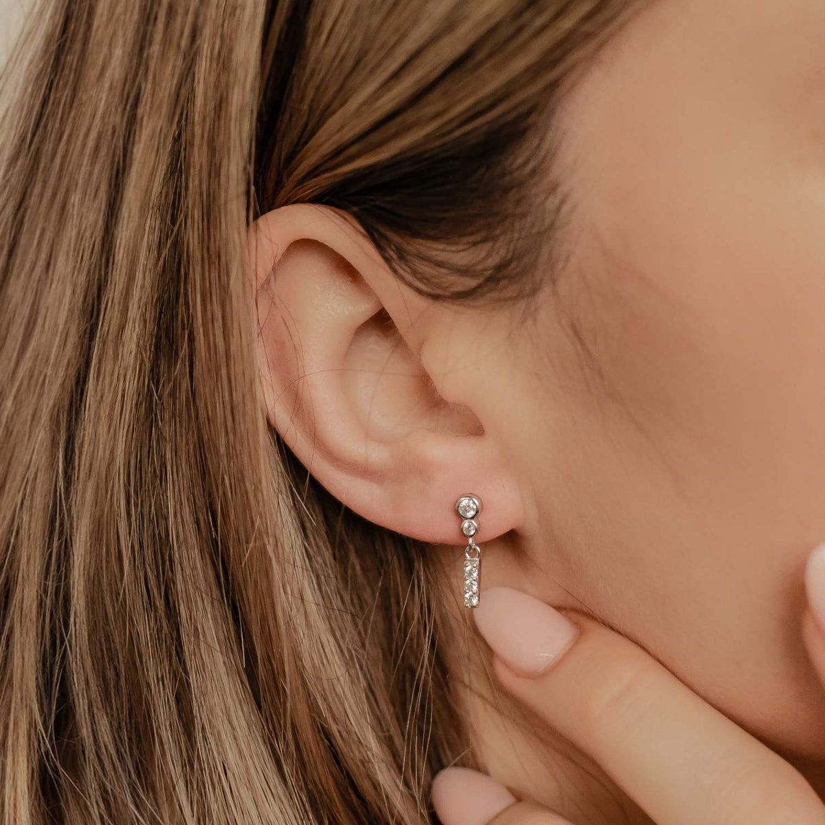 These Two Orbs Drop Stud Earrings by Hey Happiness elevate everyday elegance with their sterling silver construction and two sparkling zirconia orbs resting on the earlobe. A delicate gemstone bar dangles beneath, adding a refined touch of luxury. Available in gold and silver finishes, they’re perfect for fashion-forward styling.