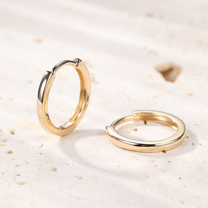 Made from solid 14 karat gold. Available in three sizes: small (20 mm), medium (30 mm), large (40 mm) diameter. Hinged hoop closure. Sold as a pair.