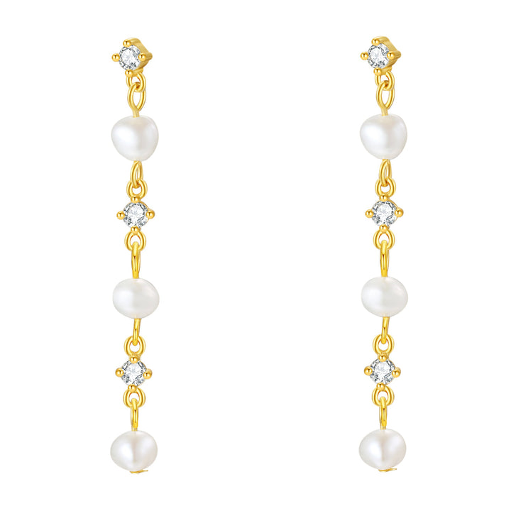 These Dangle Pearl Earrings by Hey Happiness combine elegance and movement with a handcrafted sterling silver chain featuring three lustrous freshwater pearls juxtaposed with sparkling zirconia stones. Available in gold and silver finishes, they add a graceful touch to any outfit, embodying timeless beauty and refined femininity. Ideal for elevating both casual and formal looks.