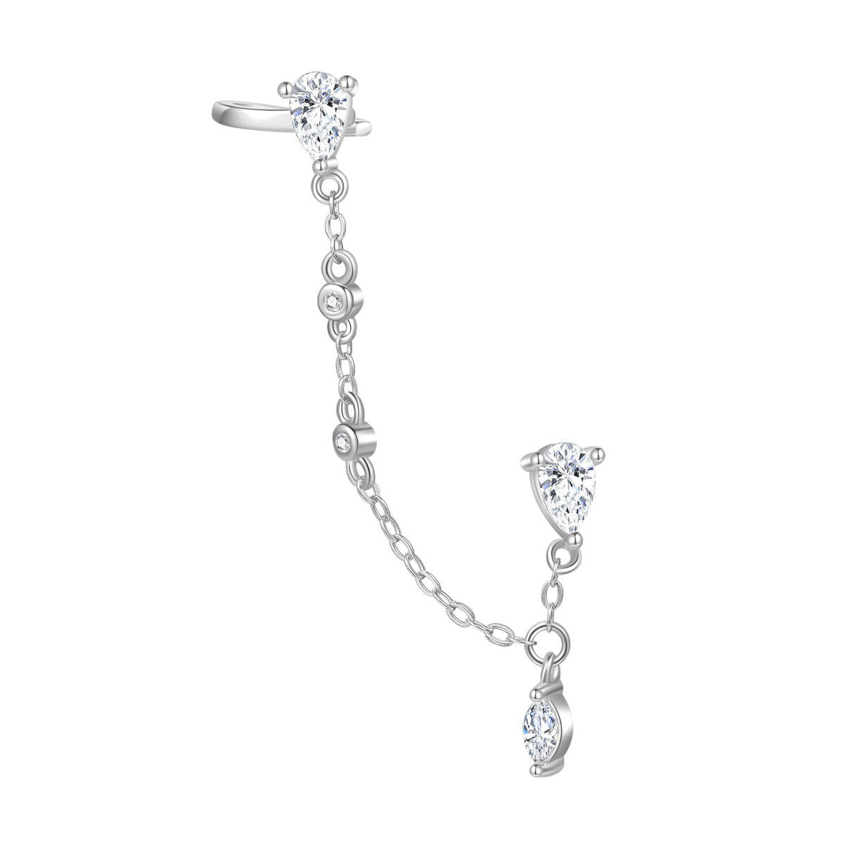 Made from 18 karat gold-plated sterling silver. Features two teardrop zirconia stones linked by a fine chain with additional zirconia accents. Secured with butterfly clasps.