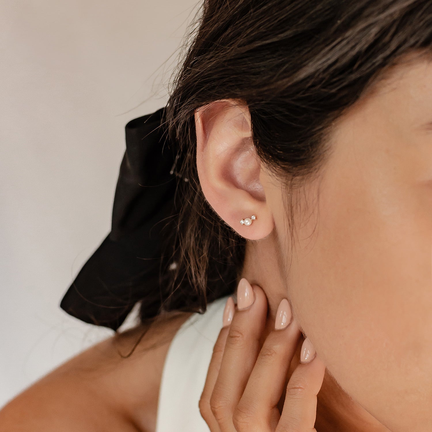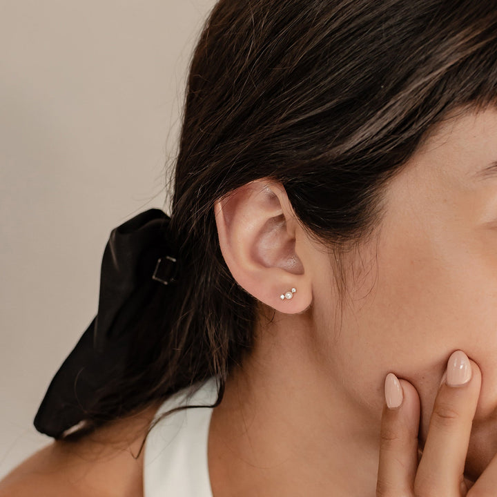 These New Beginnings Pearl Stud Earrings by Hey Happiness feature pristine pearls flanked by two small zirconia stones, set in 14 karat 585 solid gold. Symbolizing wisdom, serenity, and new starts, these studs offer a serene yet polished finish to any outfit. Perfect as a daily accessory, they reflect the brand’s commitment to meaningful and timeless elegance.