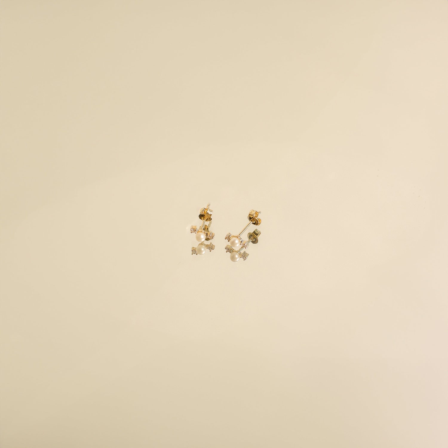 Made from solid 14 karat 585 gold with natural pearls and two small zirconia stones per earring. Secured with gold butterfly clasps.