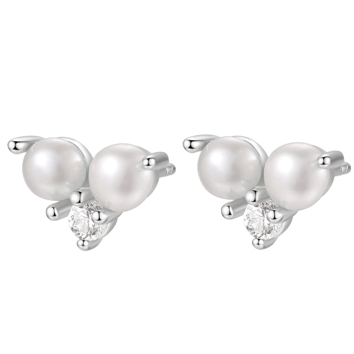 Made from sterling silver with one zirconia stone and two freshwater pearls. Butterfly clasp fastening. Sold as a pair.