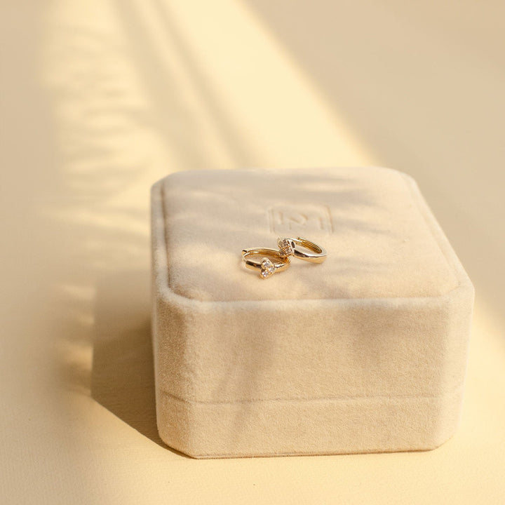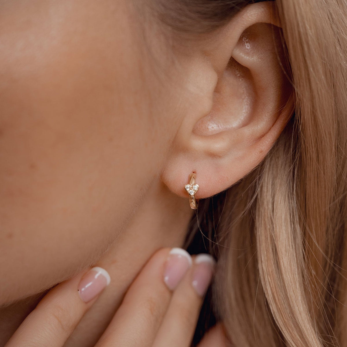 These Amore Huggie Hoop Earrings 14K Gold by Hey Happiness are crafted from solid 14 karat (585) gold and feature three small zirconia stones encrusted on the front of each hoop in a heart-shaped motif. Inspired by love and affection, these huggies are designed to fill the wearer’s life with warmth and care. Available as a single earring or matching pair, they are timeless expressions of emotion and style.