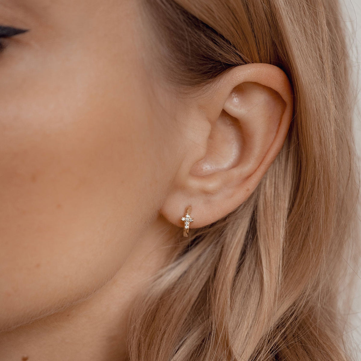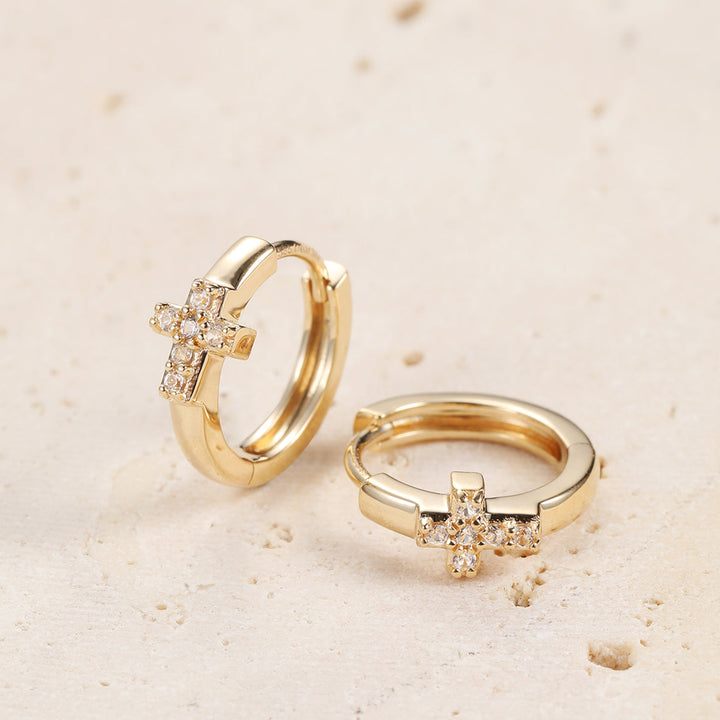 Solid 14-karat gold huggie hoops with zirconia cross detail. Sold as single or pair.