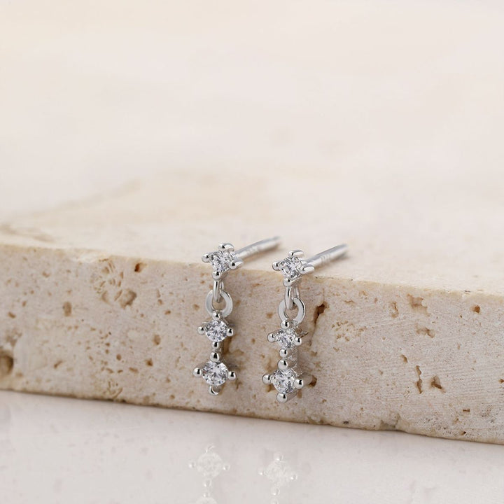 These Trio Drop Stud Earrings by Hey Happiness are delicate sterling silver studs featuring three tiny round zirconia stones—one sitting on the earlobe and two hanging vertically beneath, connected by small silver links. Secured with butterfly clasps, they offer simple, chic versatility.