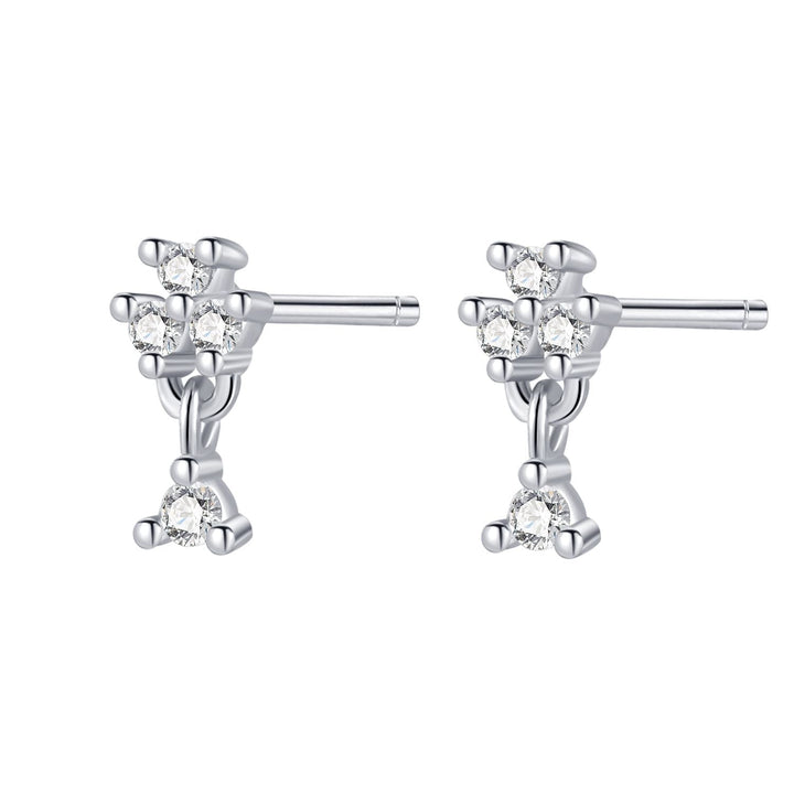 These Flower Drop Stud Earrings by Hey Happiness are sterling silver studs featuring a flower of three round zirconia stones with a fourth dangling beneath. Secured with silver butterfly clasps, they are a timeless, versatile accessory for any outfit.
