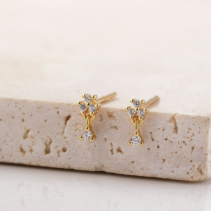 These Flower Drop Stud Earrings by Hey Happiness are crafted from sterling silver plated in 18K gold, featuring three round zirconia stones arranged in a flower formation with one dangling below. Secured with golden butterfly clasps, they offer a classic and sophisticated look that transcends seasons.