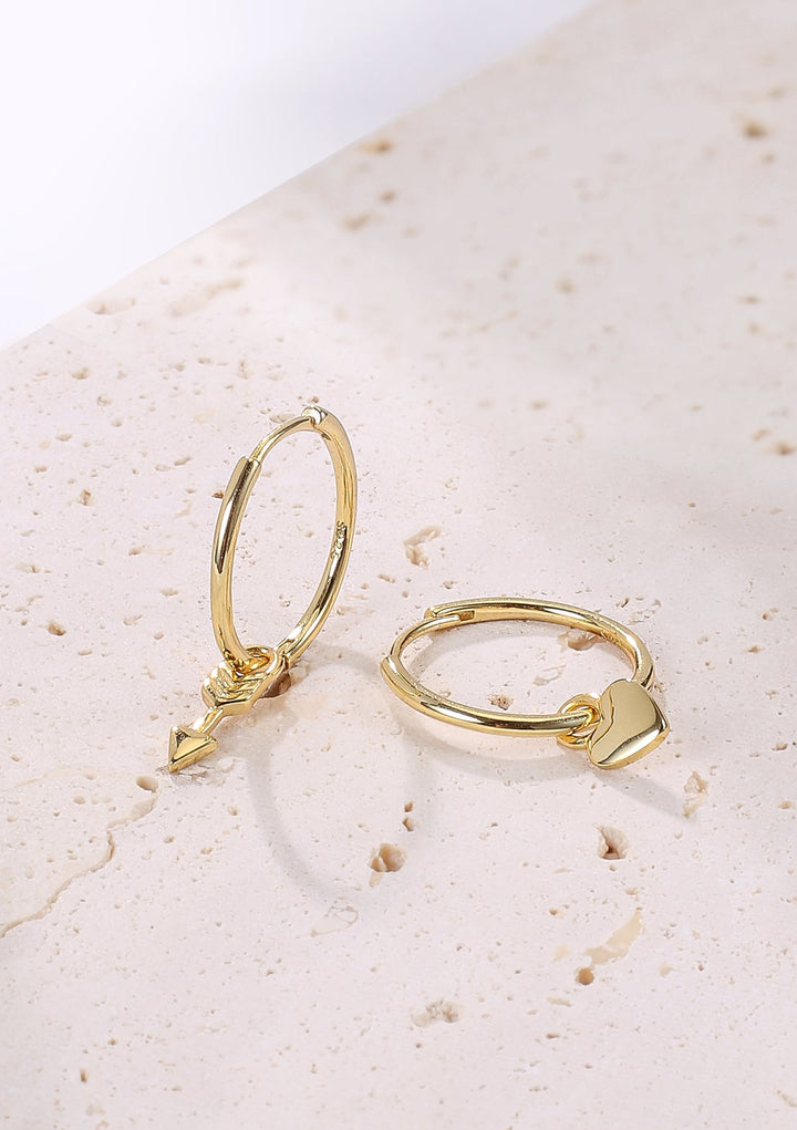 Heart and Arrow Charm Hoop Earrings Sterling Silver Gold
