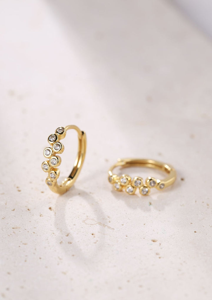 Made from 18 karat gold-plated sterling silver. Small huggie hoops with eight round zirconia stones set alternately along the front edge. Hinged clasp.