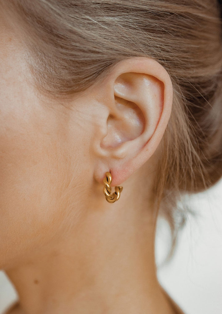 These Mini Rope Hoop Earrings by Hey Happiness are small, twisted half-hoops crafted from 18-karat gold-plated stainless steel. Their intertwined rope design and golden butterfly clasps offer a dainty yet striking accessory that complements everything from casual tees to tailored blazers.