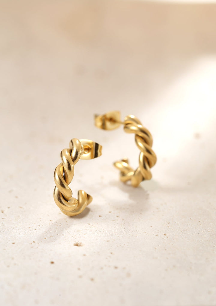 18-karat gold-plated stainless steel twisted half-hoop earrings. Butterfly clasp closure.