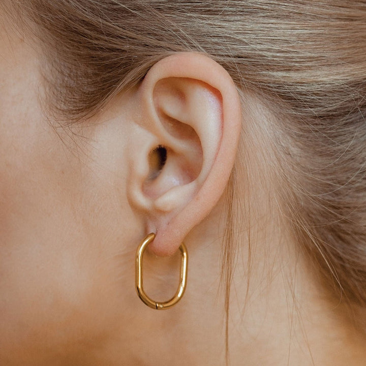 These Thin Oval Hoop Earrings by Hey Happiness offer a polished, modern classic look. Made from stainless steel, they feature gentle curves, rounded edges, and a thin ear piece for comfortable wear. The hinged opening ensures easy on-and-off. Available in 18K gold plating and silver finishes.