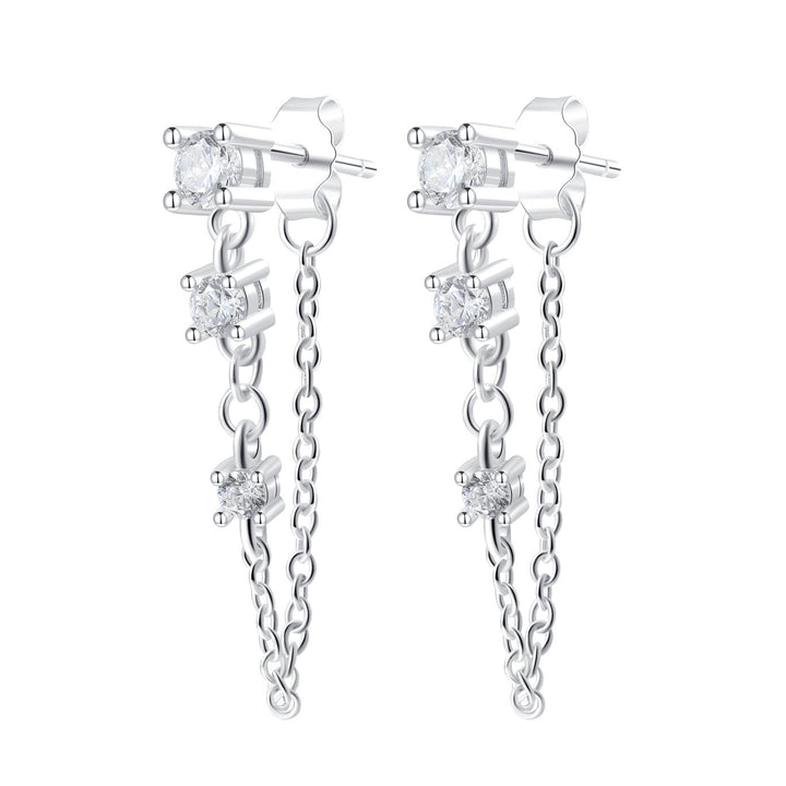 Made from 925 sterling silver. Features three round zirconia stones on a thin chain connecting stud to butterfly clasp. Sold as a pair.