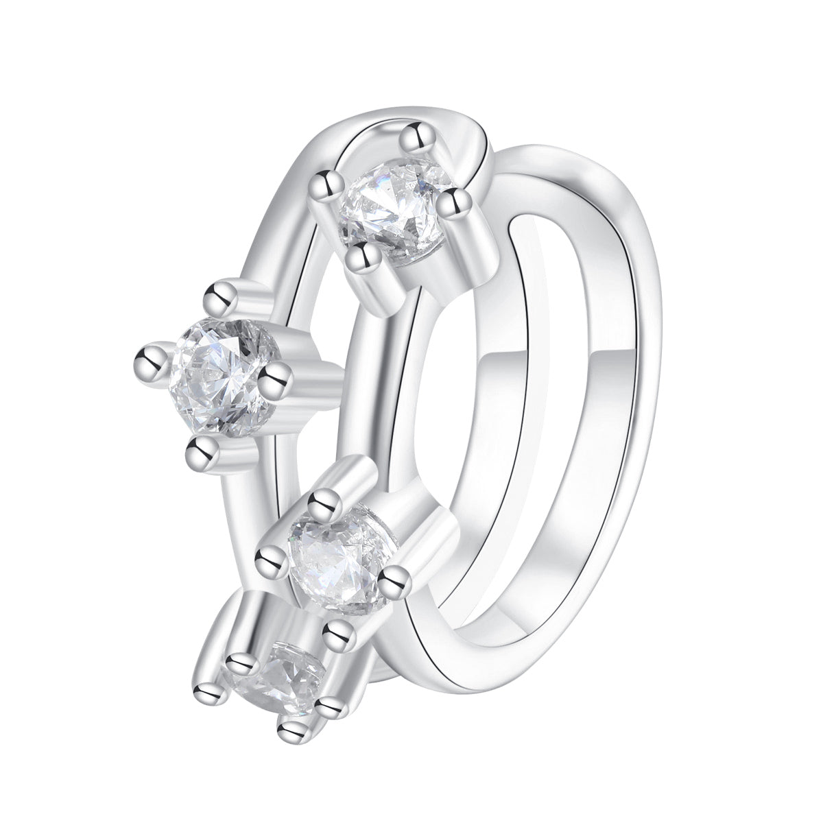 Crafted from sterling silver with four round zirconia stones. Open band design for adjustable fit.
