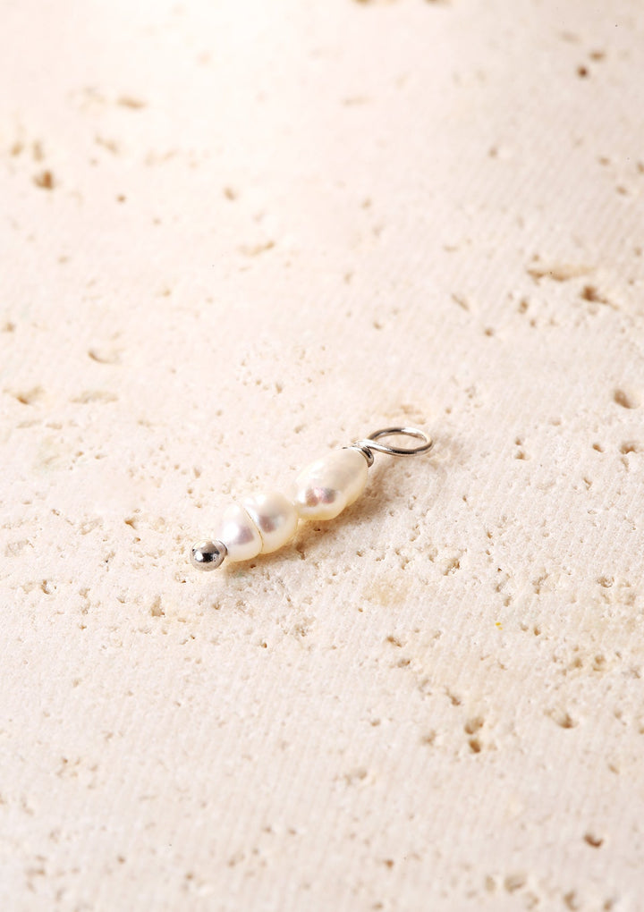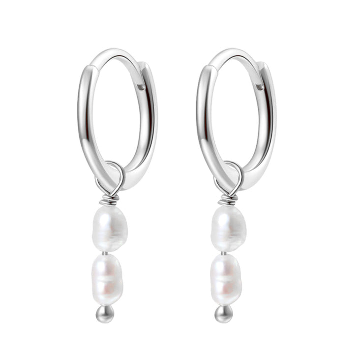 Made from sterling silver. Hoop earrings with hinged opening and detachable double natural pearl charms. Two purchase options: hoops with charms or charms only.