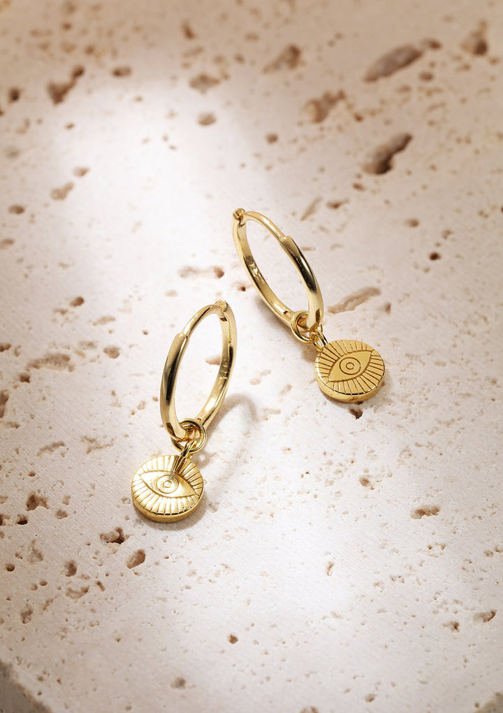 Made from 18 karat gold-plated sterling silver. Small hoop earrings with removable evil eye engraved charms. Option to purchase hoops with charms or charms only.