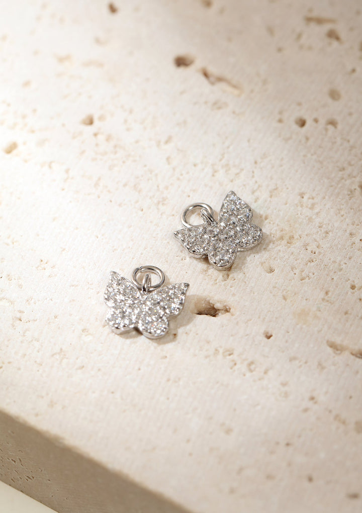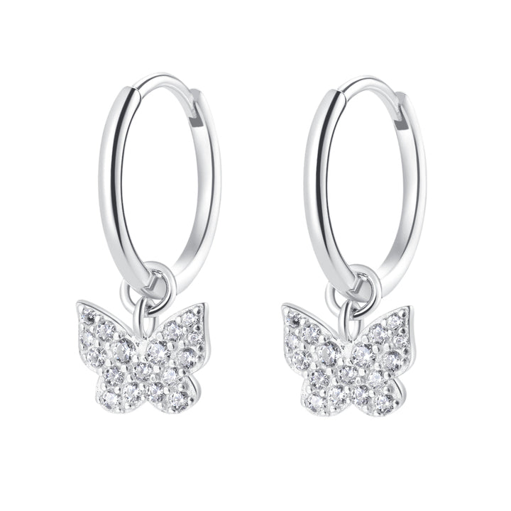 Crafted from sterling silver. Small hoop earrings with detachable butterfly charms set with zirconia stones. Purchase options: hoops with charms or charms only.