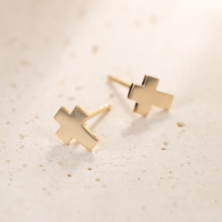 Made from 14k 585 solid gold. Cross-shaped stud earrings. Includes matching posts and gift-ready packaging. Option to purchase single or pair.