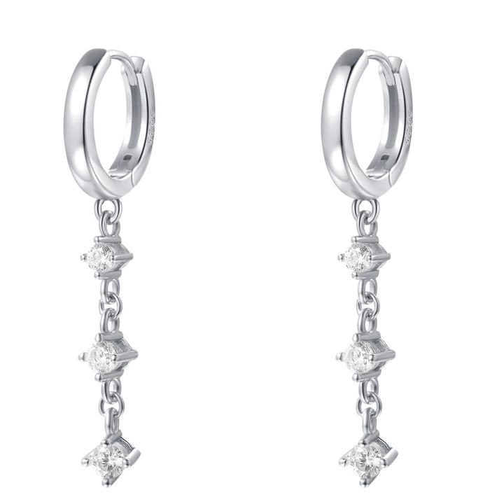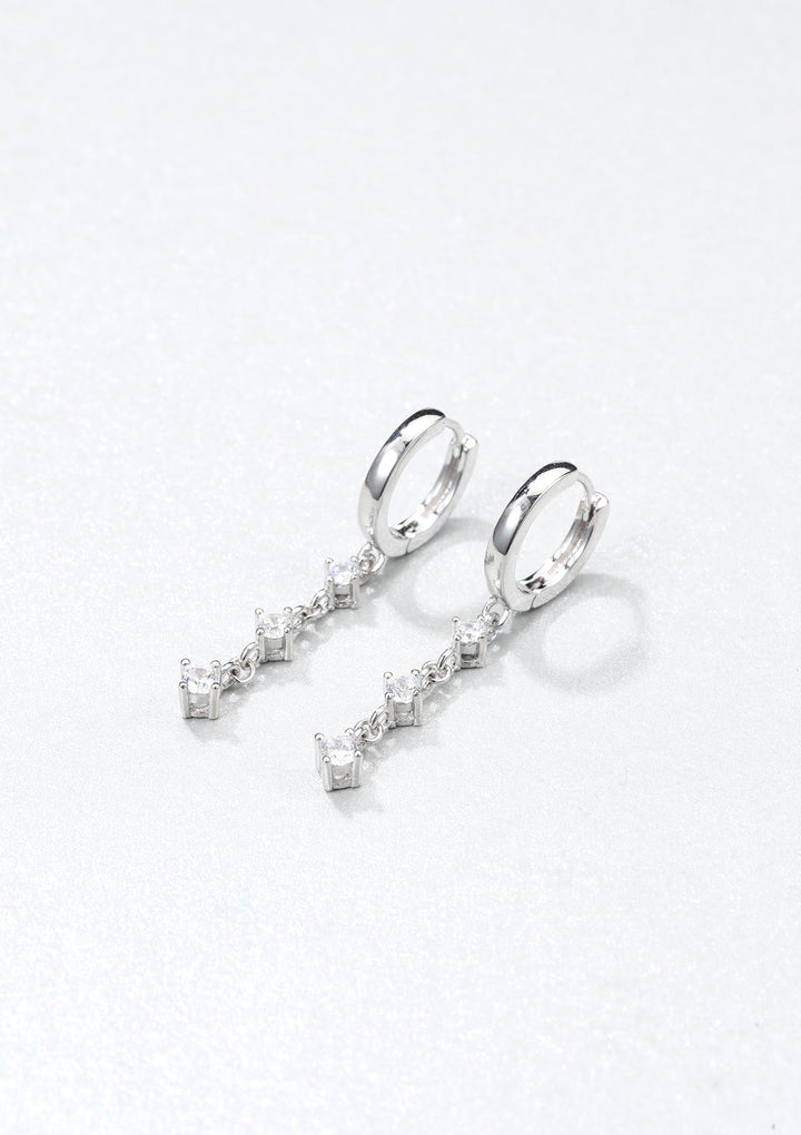 Sterling silver hoops with three dangling zirconia stones. Hinge closure.