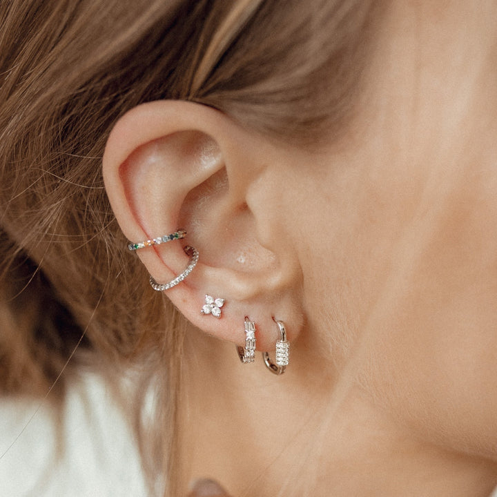 Crafted from 925 sterling silver with five rows of tiny zirconia stones on the carabiner detail. Oval huggie design with thin earpiece.