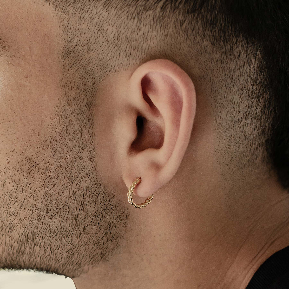 Made from 18 karat gold-plated sterling silver. Hinged hoop design with braided rope texture. Thin metal earpiece with U-shaped snap closure.