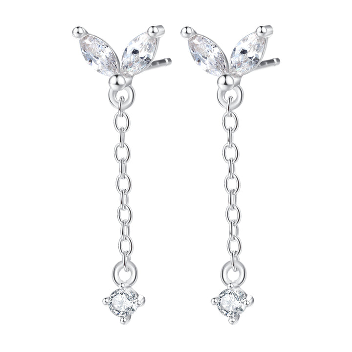 Made from sterling silver. Features two marquise-cut zirconia stones on the stud front, with a small round zirconia drop attached by a thin chain. Silver butterfly clasps secure the earrings.