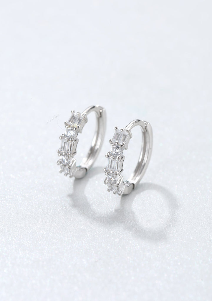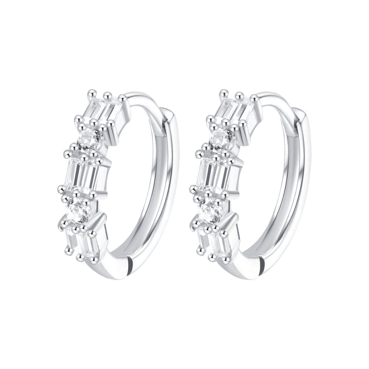 Made from 925 sterling silver. Hoops set with six baguette-cut zircon stones and two round zircon stones. Hinged clasp for easy wear. Available as pair.