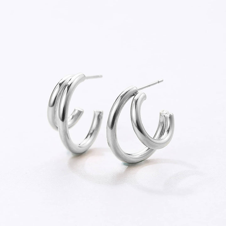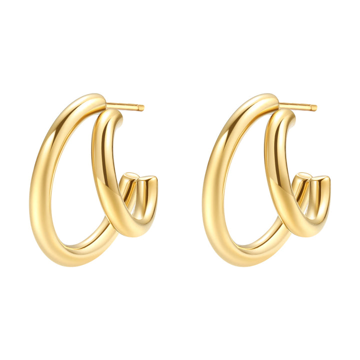 These Double Side Hoop Earrings by Hey Happiness offer a unique, modern twist on the classic hoop silhouette with a smaller hoop embracing a larger one, both meeting at the front next to the slender ear piece. Crafted from plated stainless steel, these 3/4 hoops are secured with butterfly clasps for all-day comfort and security. Available in gold, rose gold, and silver, they bring subtle sophistication and contemporary flair to any outfit or occasion.