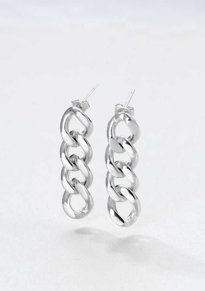 These Chunky Curb Chain Dangle Earrings by Hey Happiness offer bold, modern style in stainless steel. Featuring four chunky curb chain links connected vertically, they create striking movement and texture. Secured with silver butterfly clasps, they effortlessly transition from casual to evening looks, adding edge and sophistication.