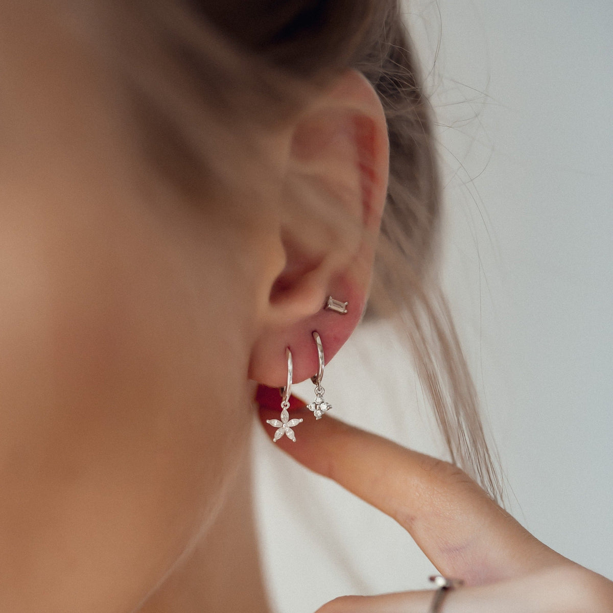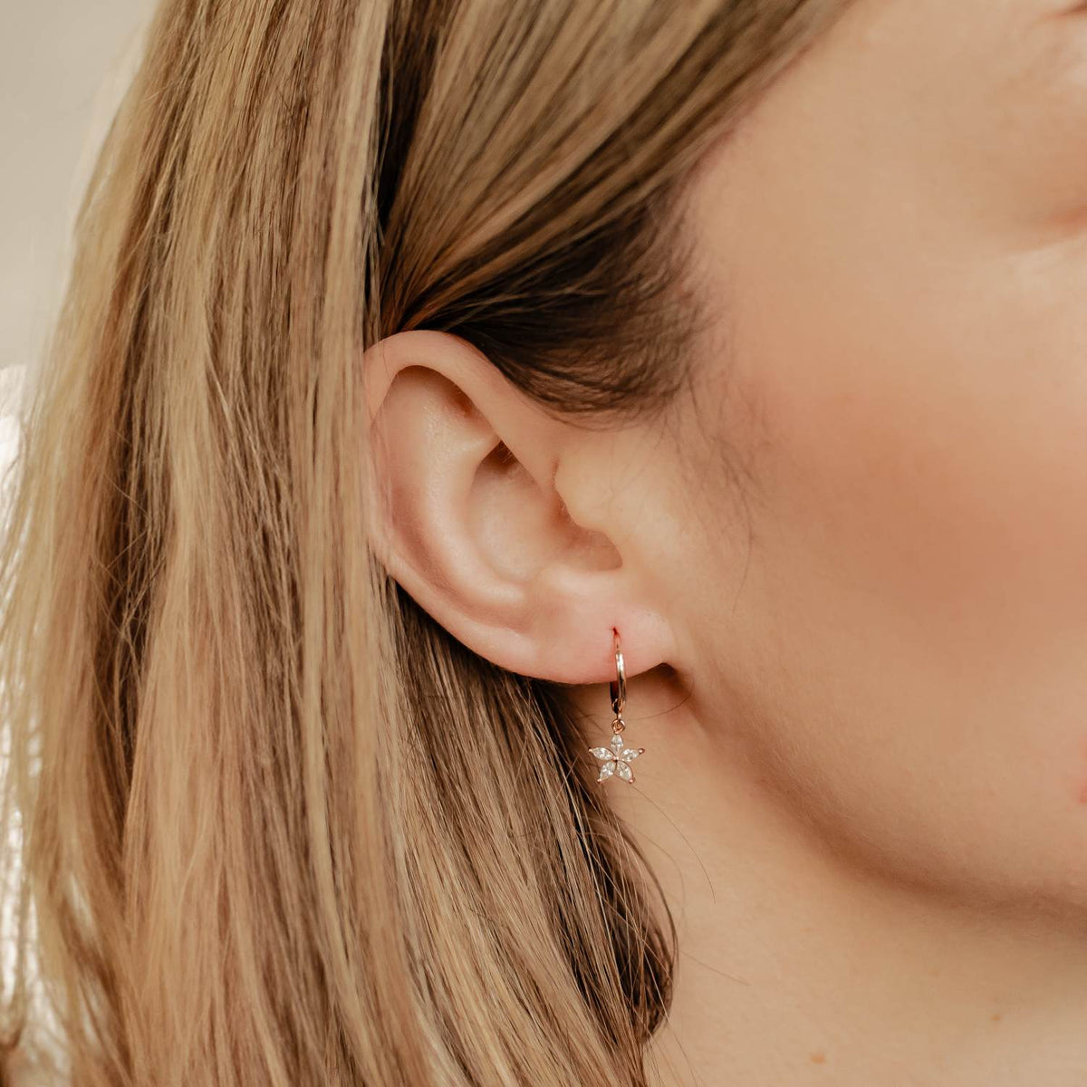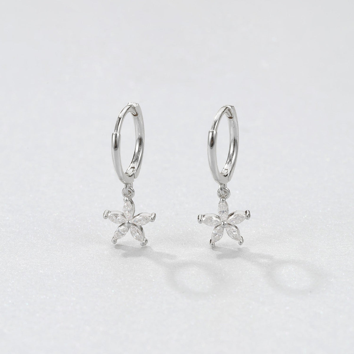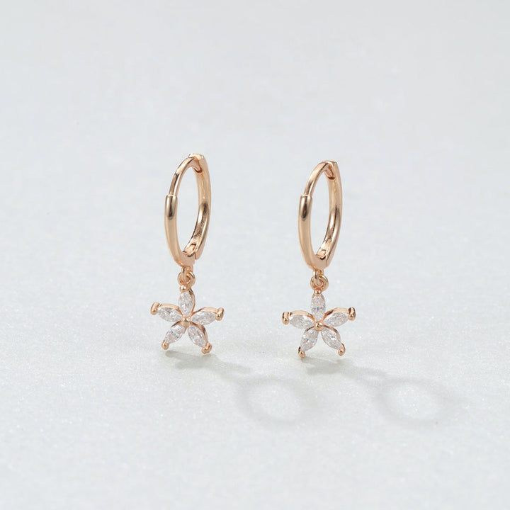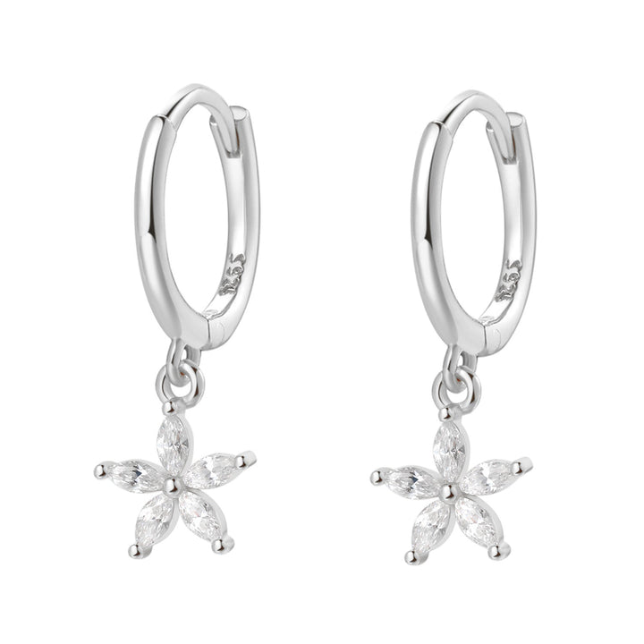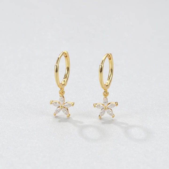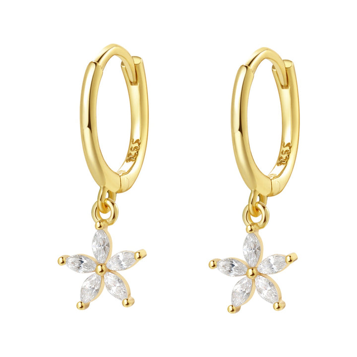 These Gemstone Daisy Huggie Earrings by Hey Happiness offer a polished and sophisticated take on floral motifs. Crafted from sterling silver, they feature a small thin hoop with a dangling daisy-shaped pendant composed of five clear Marquise zircon stones. The hinged opening mechanism ensures easy wear and removal. Available in 18K gold plated, 18K rose gold plated, and silver, they elevate any ensemble with their refined sparkle and graceful silhouette. Ideal for layering or as a standout piece for elegant occasions.