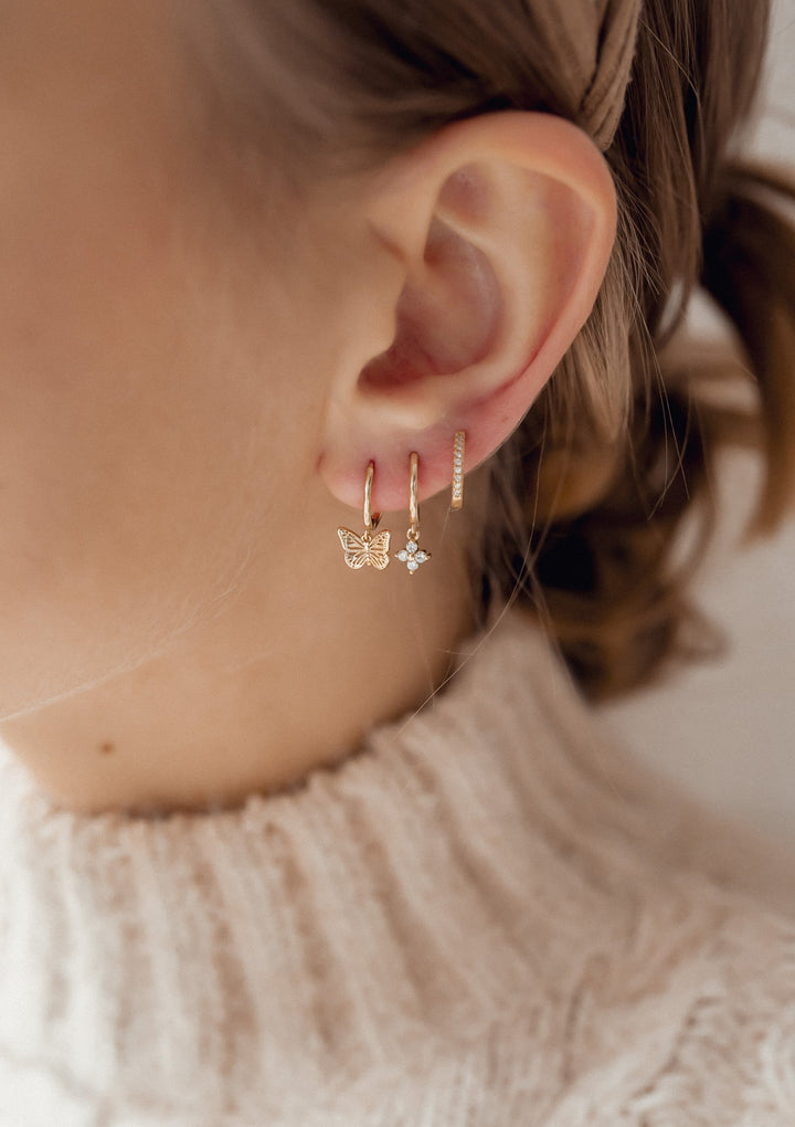 These Butterfly Huggie Earrings by Hey Happiness showcase 18 karat gold-plated sterling silver craftsmanship with a delicate butterfly pendant engraved with intricate wing details hanging from the lower edge of a small hoop. The thin ear piece creates a seamless, rounded silhouette that embraces the earlobe, blending modern sophistication with a flirty charm. Perfectly suited to elevate both casual denim looks and elegant dresses, these earrings are a versatile statement of graceful femininity.