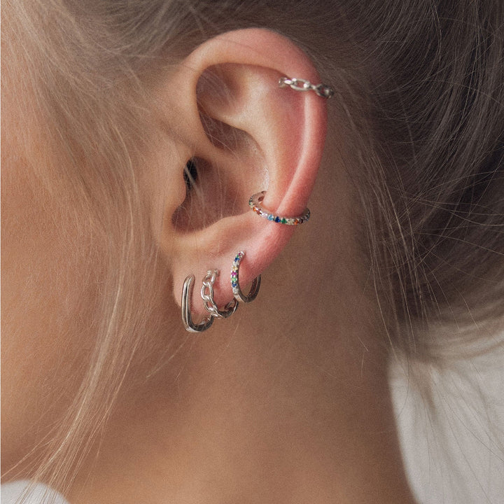 Sterling silver with hinge closure and thin earpiece. Available in 18K gold plated, 18K rose gold plated, and silver.