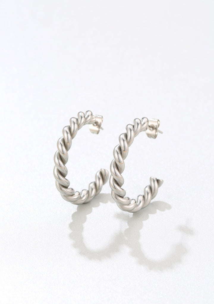 These Twisted Rope Hoop Earrings by Hey Happiness are small 3/4 hoops crafted from stainless steel with a twisted rope design, where two strands elegantly intertwine along the band. The top end connects to a thin ear piece that threads through the lobe, secured by silver butterfly clasps. Understated and timeless, they are a modern take on the classic hoop, seamlessly complementing any style or silhouette.